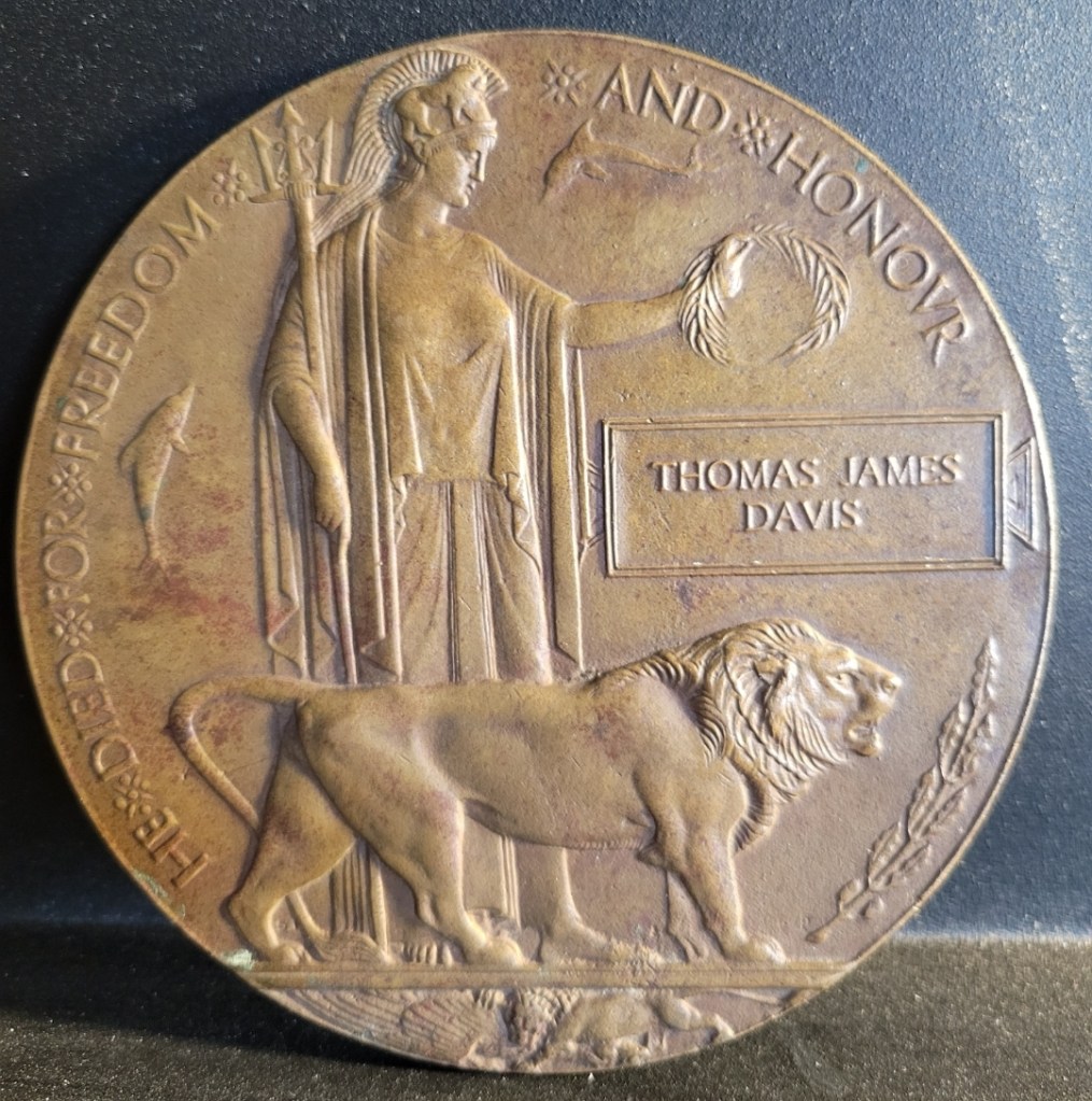 I count myself fortunate to have been able to return the last ‘Dead Man’s Penny’ to the family of Fernand Colleaux. That said, I’m equally fortunate to now have the penny awarded to the family of Thomas Davis. Although I have not been able to locate photos, I have found a myriad of life and military records that give us a picture of who Thomas was and what was his fate.