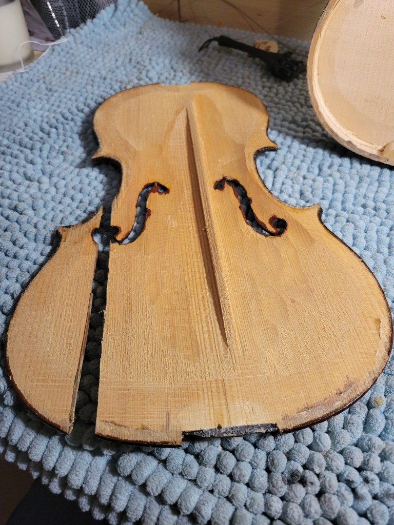 Step one was to re-graduate the top and bottom plates. The original bassbar was integral, so I planed it off and added a proper bassbar. Then, structural repairs had to be made: