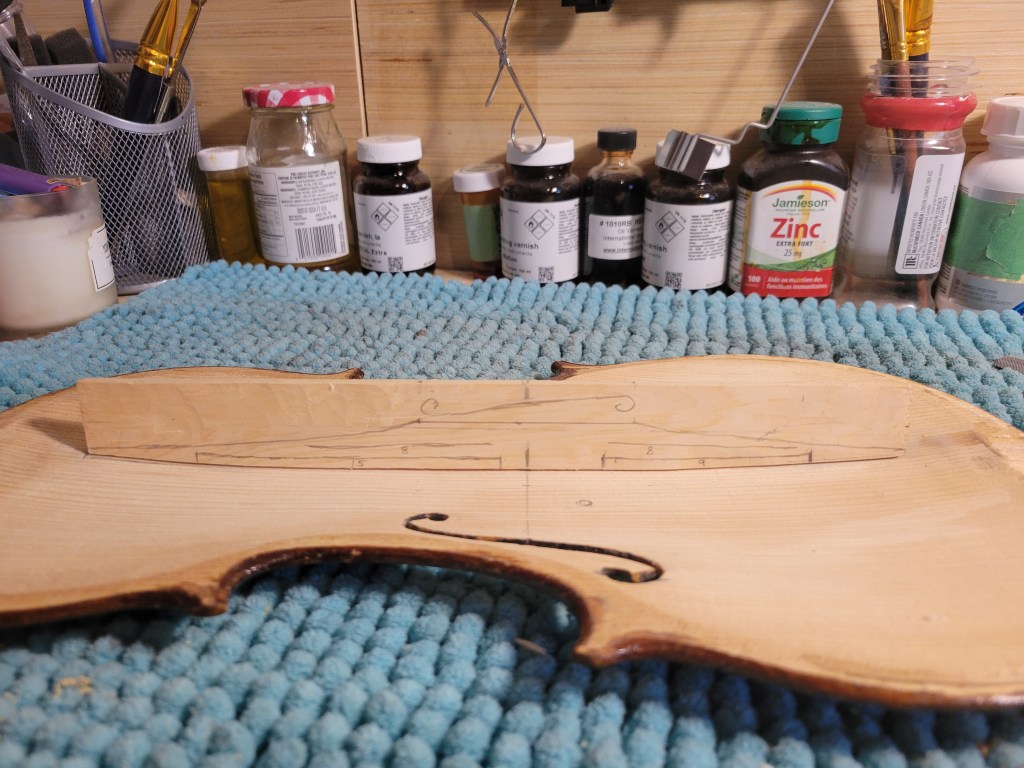 I also decided to make the bass bar slightly heavier than normal. Don’t ask me why, but I thought it might be the thing to do. In retrospect, the reeds could have been a little further apart, but I was careful not to allow them to touch each other or the violin plate. Would have been nicer if they’d been even and straight, but damn that’s hard to do, especially with a bit of warping and distortion.