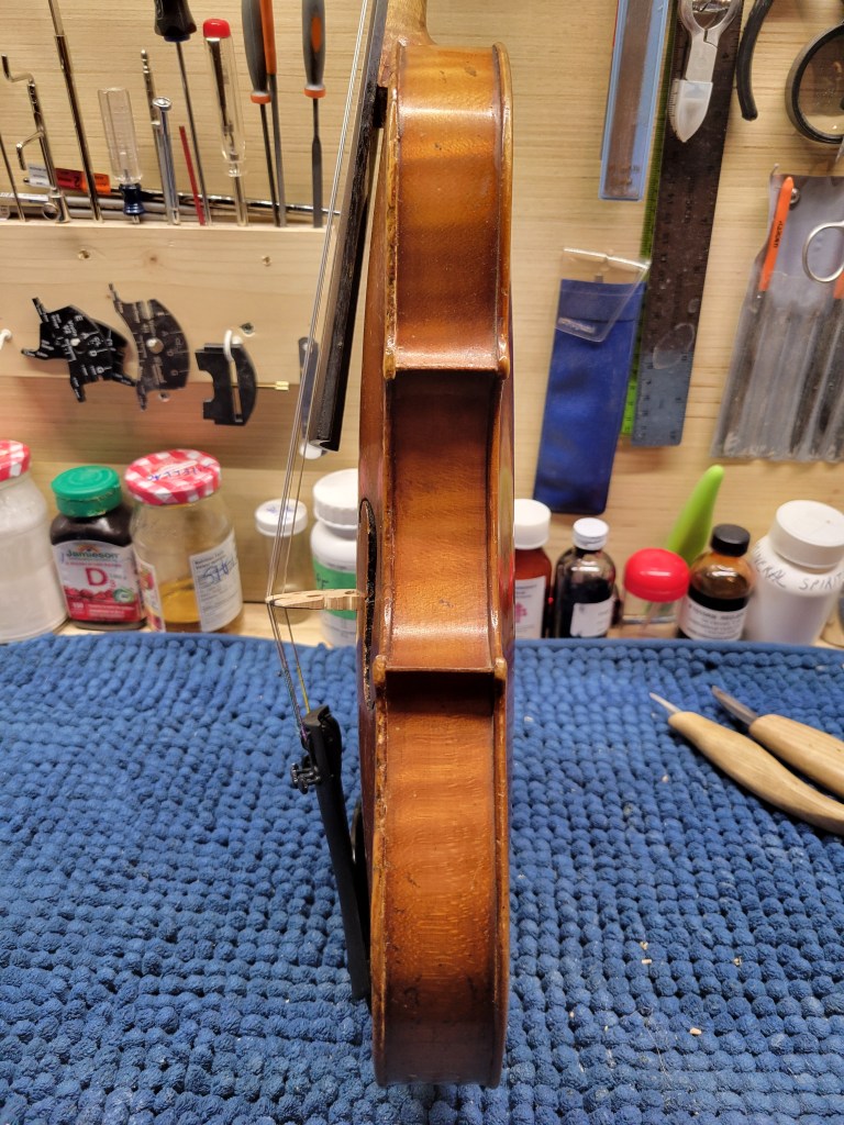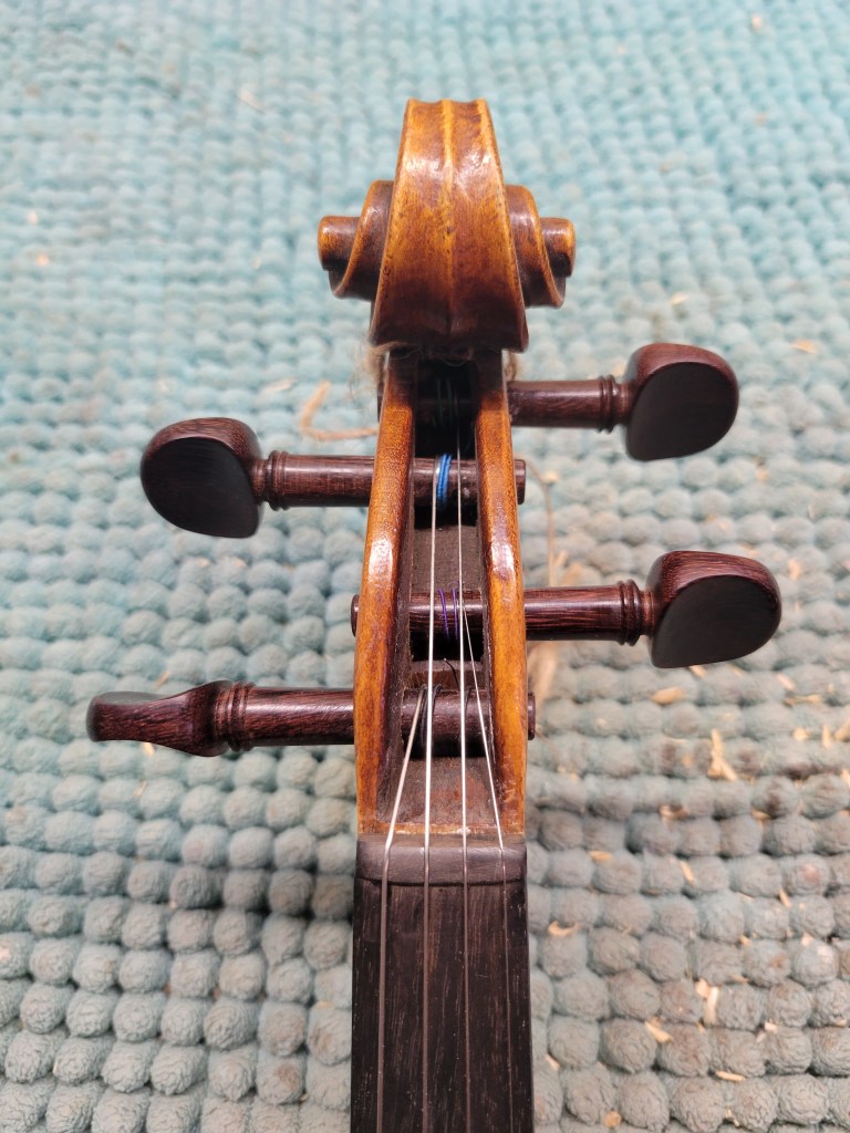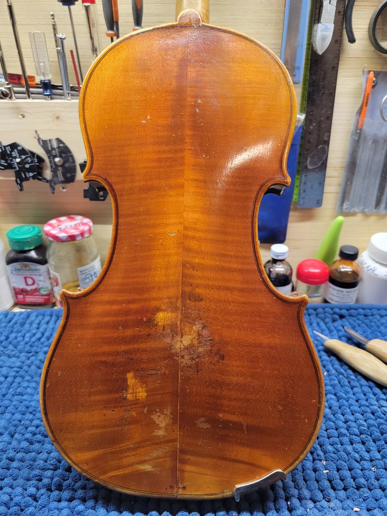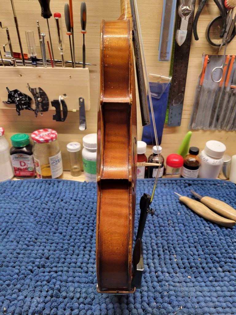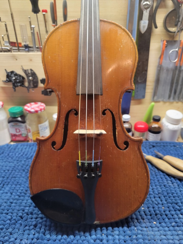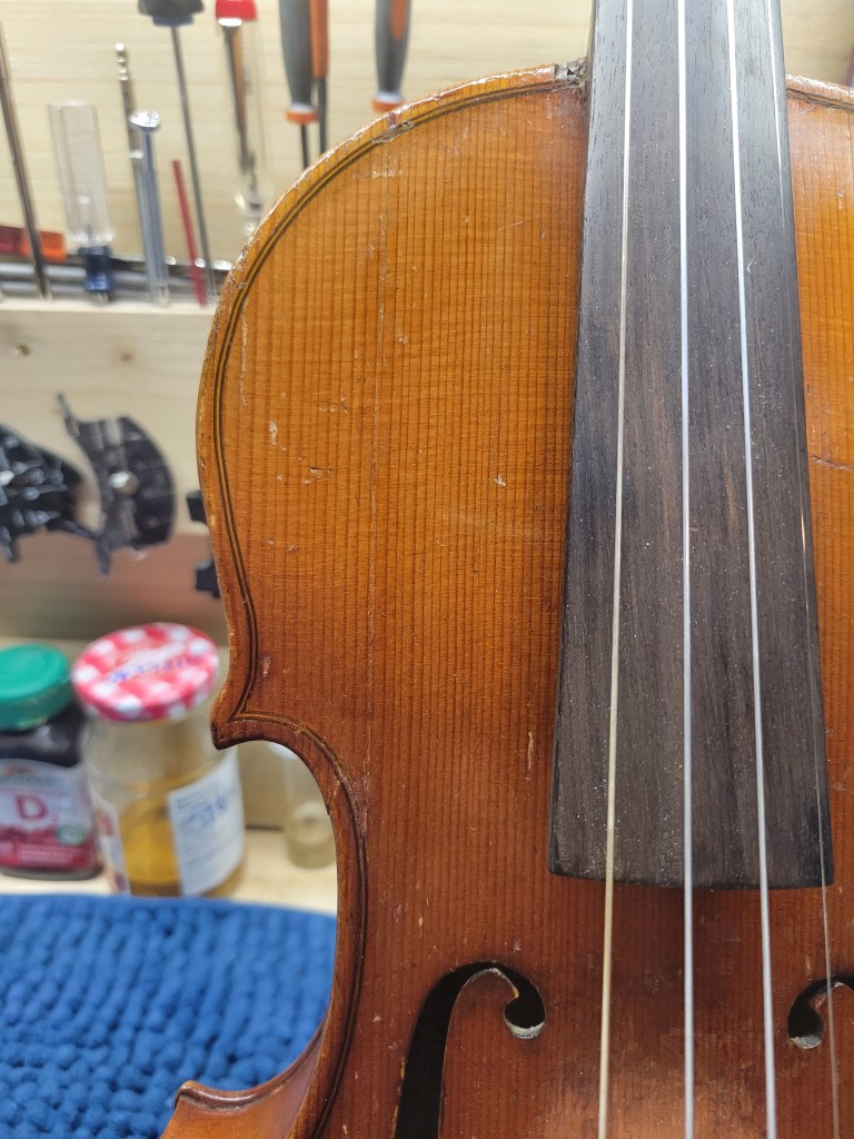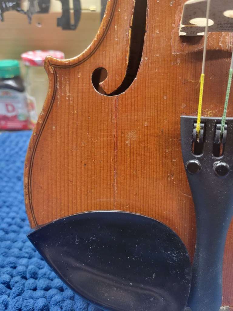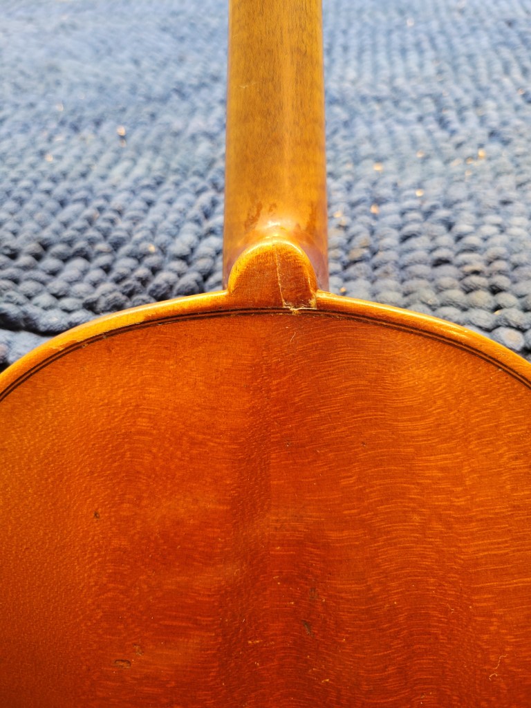 This 4/4 Stradivarius copy comes with intriguing provenance. Brought to the new province of Saskatchewan in 1905 by a ten-year-old Scottish immigrant lad, it has certainly seen its share of mishaps. At the same time, after some serious, but solid repairs, it also maintains a nice tone and great playability! The following pictures show some of the repairs. It is fitted with new pegs, Wittner tailpiece, and best of all… Dominant strings (a hundred dollar value alone). A piece of history can be yours for only $350.