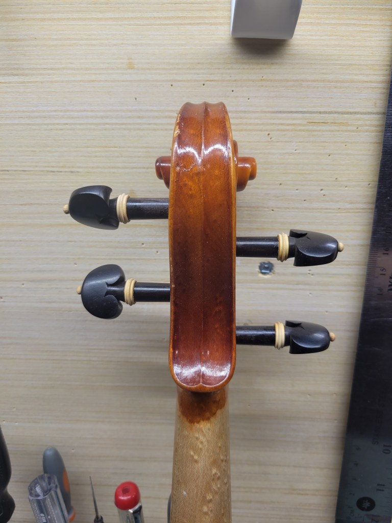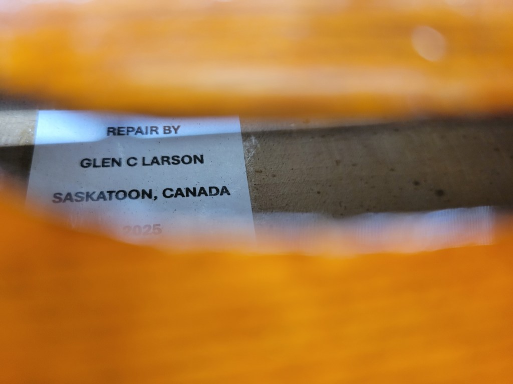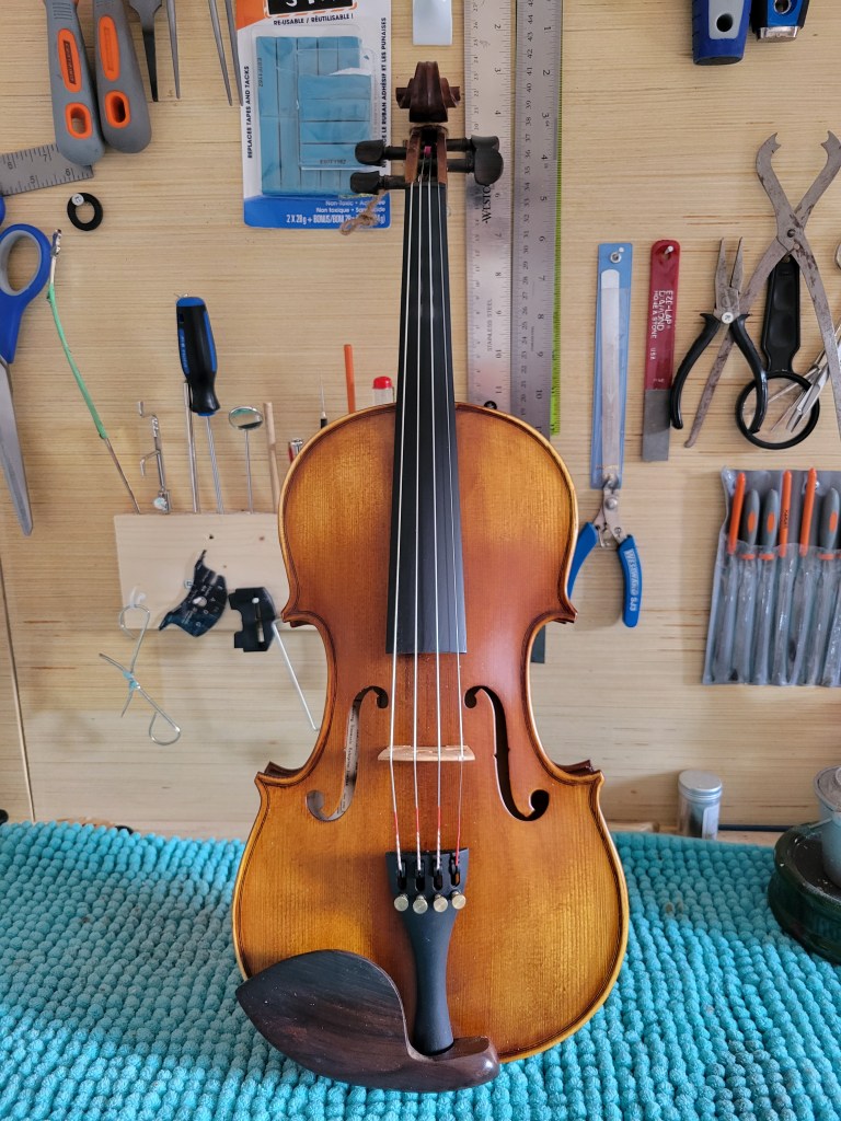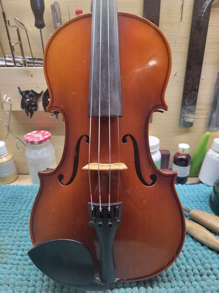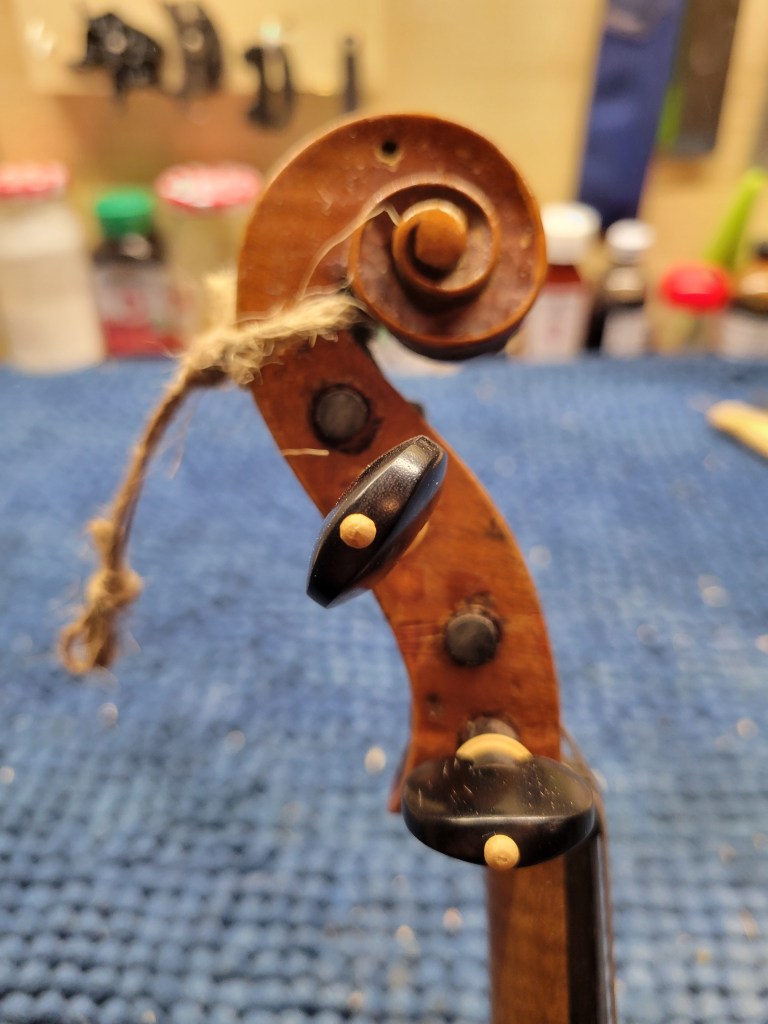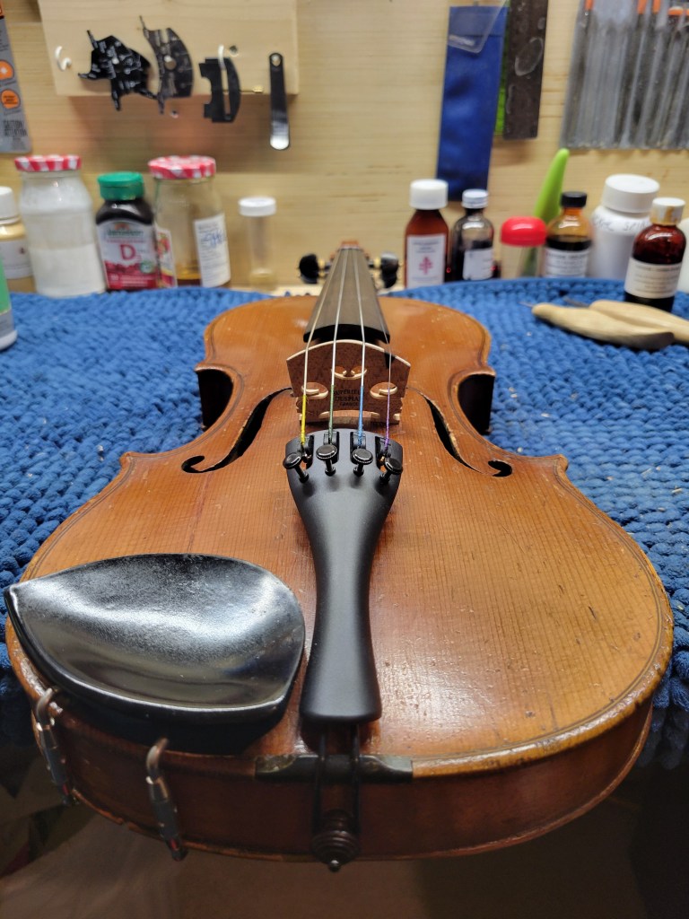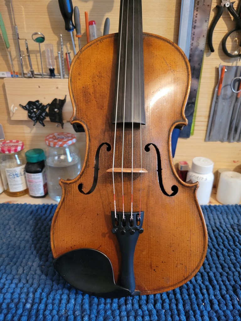This 4/4 Stradivarius copy comes with intriguing provenance. Brought to the new province of Saskatchewan in 1905 by a ten-year-old Scottish immigrant lad, it has certainly seen its share of mishaps. At the same time, after some serious, but solid repairs, it also maintains a nice tone and great playability! The following pictures show some of the repairs. It is fitted with new pegs, Wittner tailpiece, and best of all… Dominant strings (a hundred dollar value alone). A piece of history can be yours for only $350.