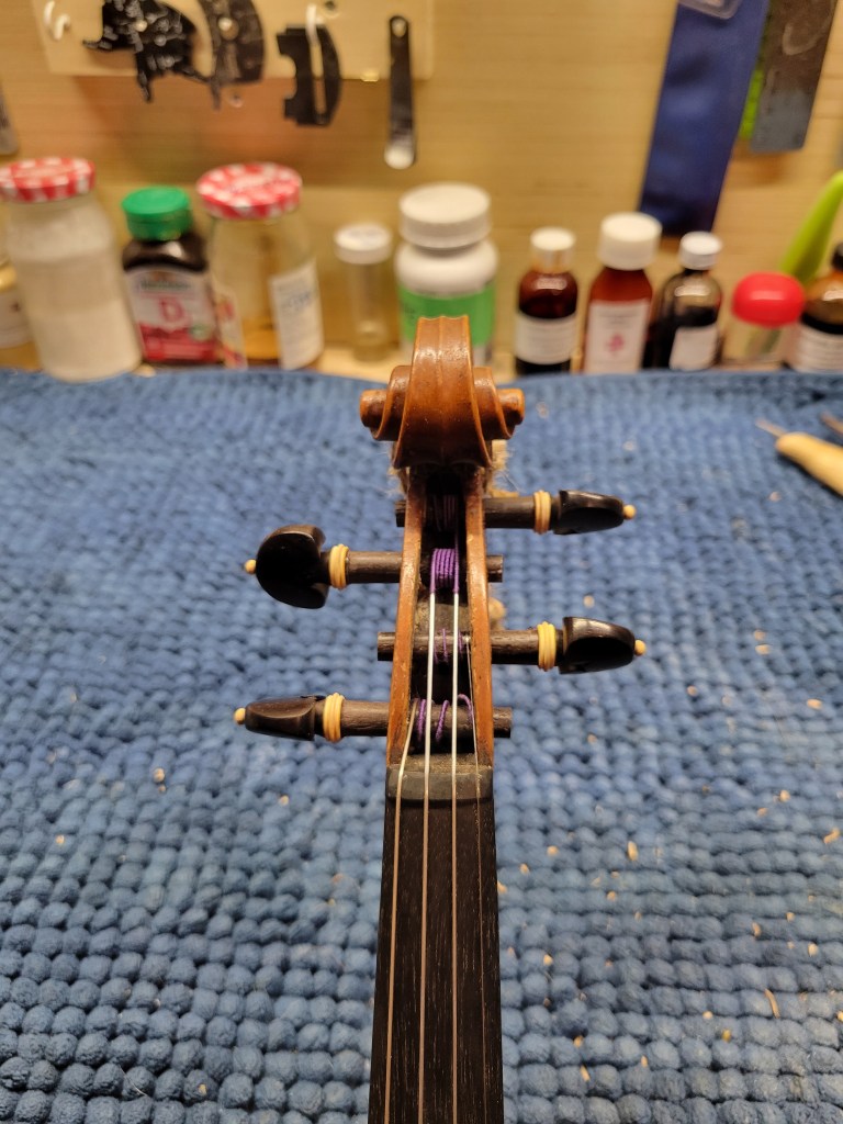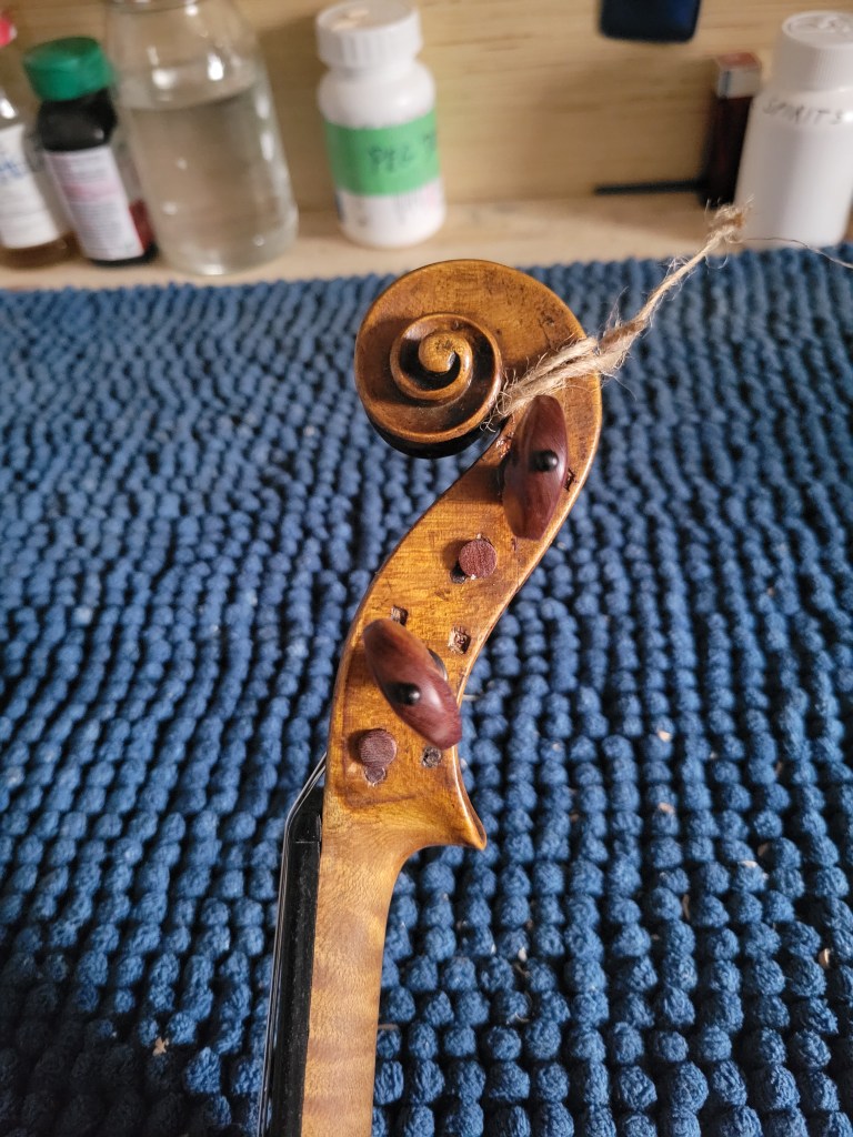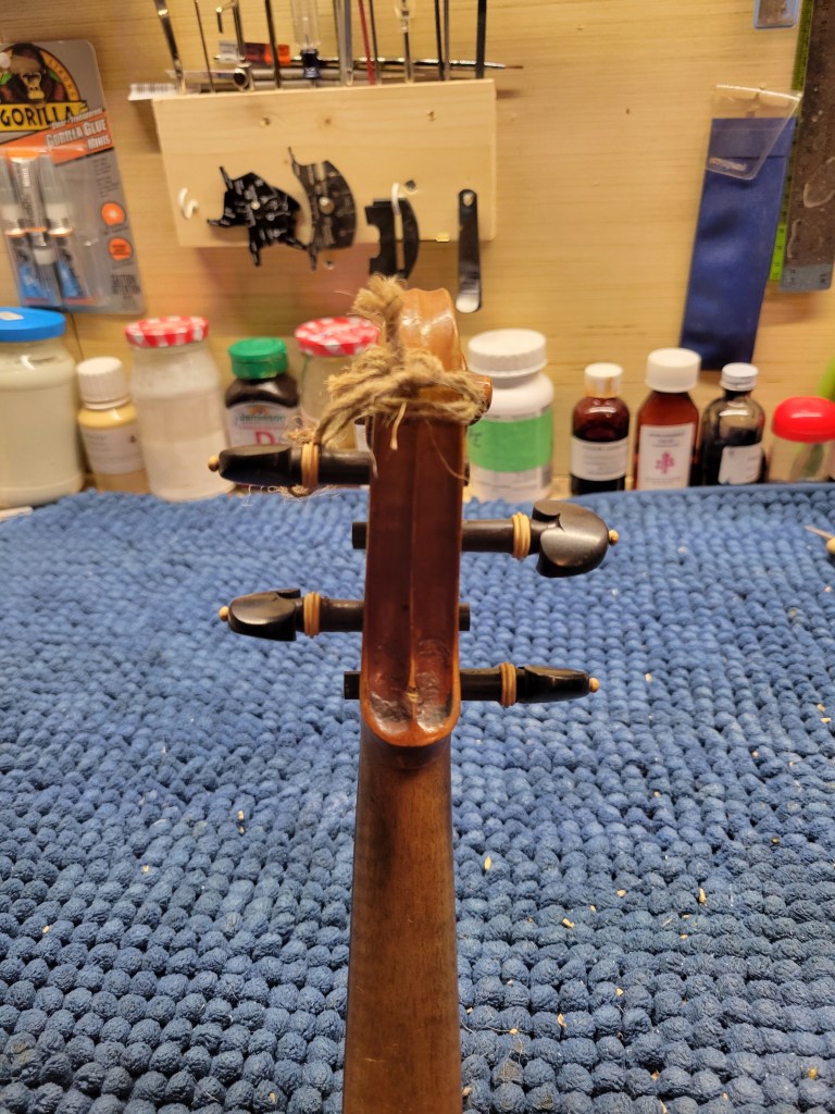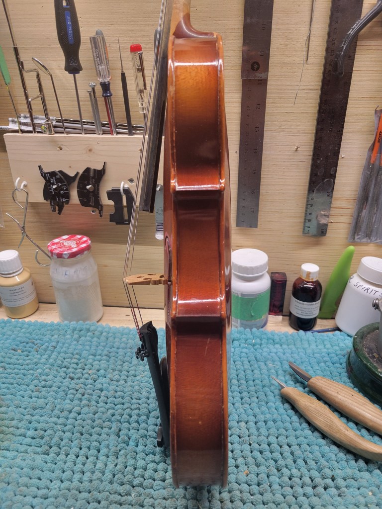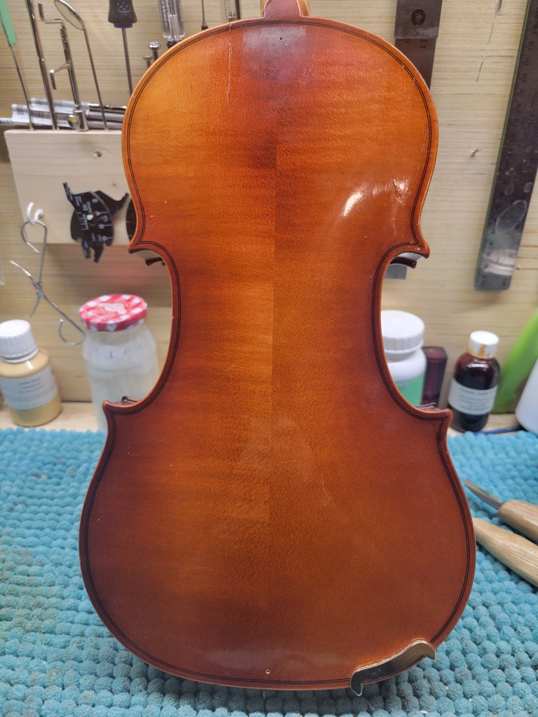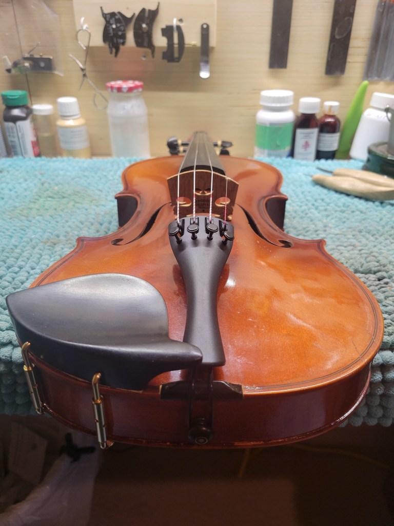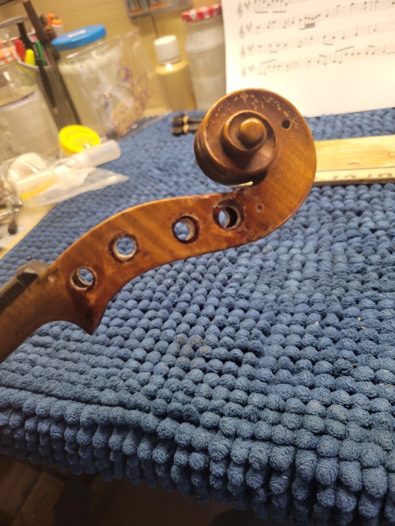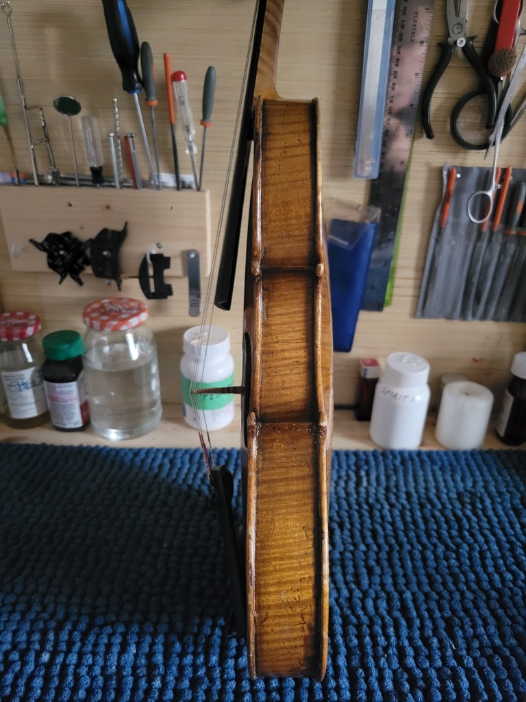 This 4/4 Stradivarius copy comes with intriguing provenance. Brought to the new province of Saskatchewan in 1905 by a ten-year-old Scottish immigrant lad, it has certainly seen its share of mishaps. At the same time, after some serious, but solid repairs, it also maintains a nice tone and great playability! The following pictures show some of the repairs. It is fitted with new pegs, Wittner tailpiece, and best of all… Dominant strings (a hundred dollar value alone). A piece of history can be yours for only $350.