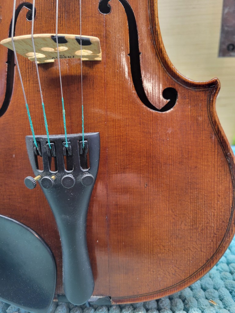 ‘Conservatory Violin’: A quite nice 4/4 size violin from the early to mid twentieth century. These violins are well made, with the playability and sound you would expect from a German instrument. . I have repaired a saddle crack on the top (see picture). Comes with new bridge, tuning pegs, Wittner tail piece, new Pirastro Tonica strings. European craftsmanship for only $400.