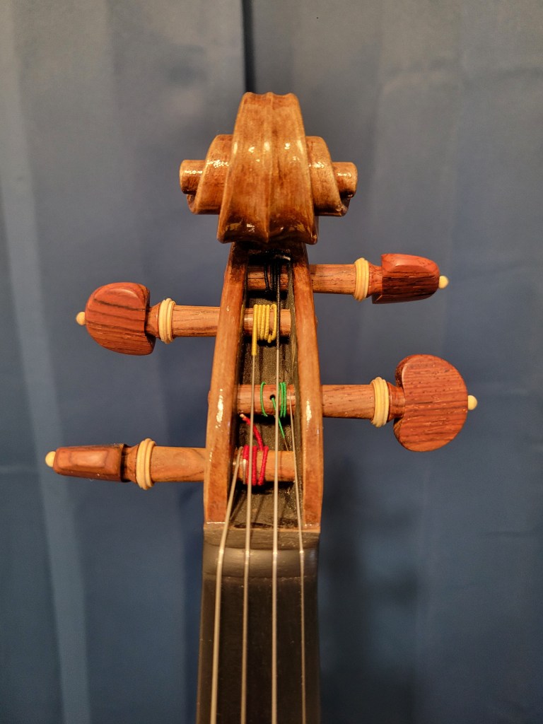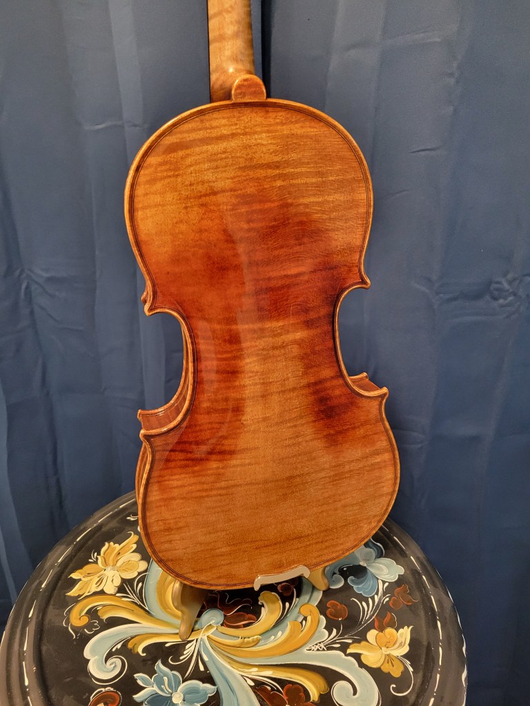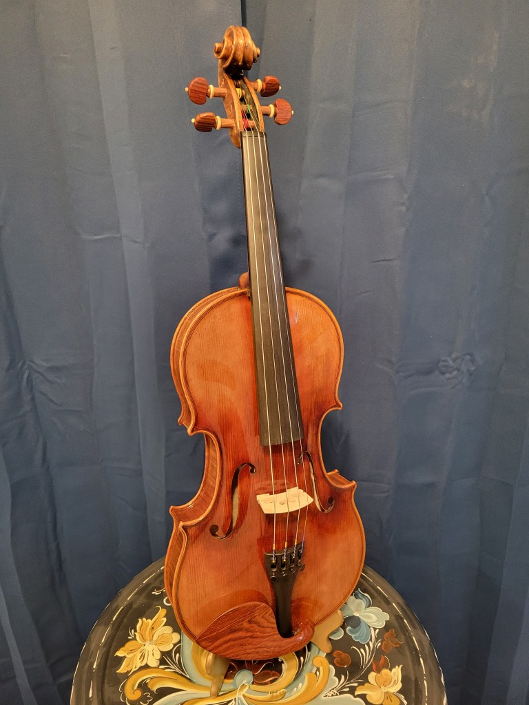 Amati Copy: Made with BIG German arching, I have revoiced this violin and replaced the neck and pegbox. A very interesting and great sounding instrument. New Helicore medium strings, tuning pegs, bridge, Wittner tailpiece, endpin, soundpost. Ebony fingerboard. Beautiful one-piece back. Priced at $450
